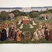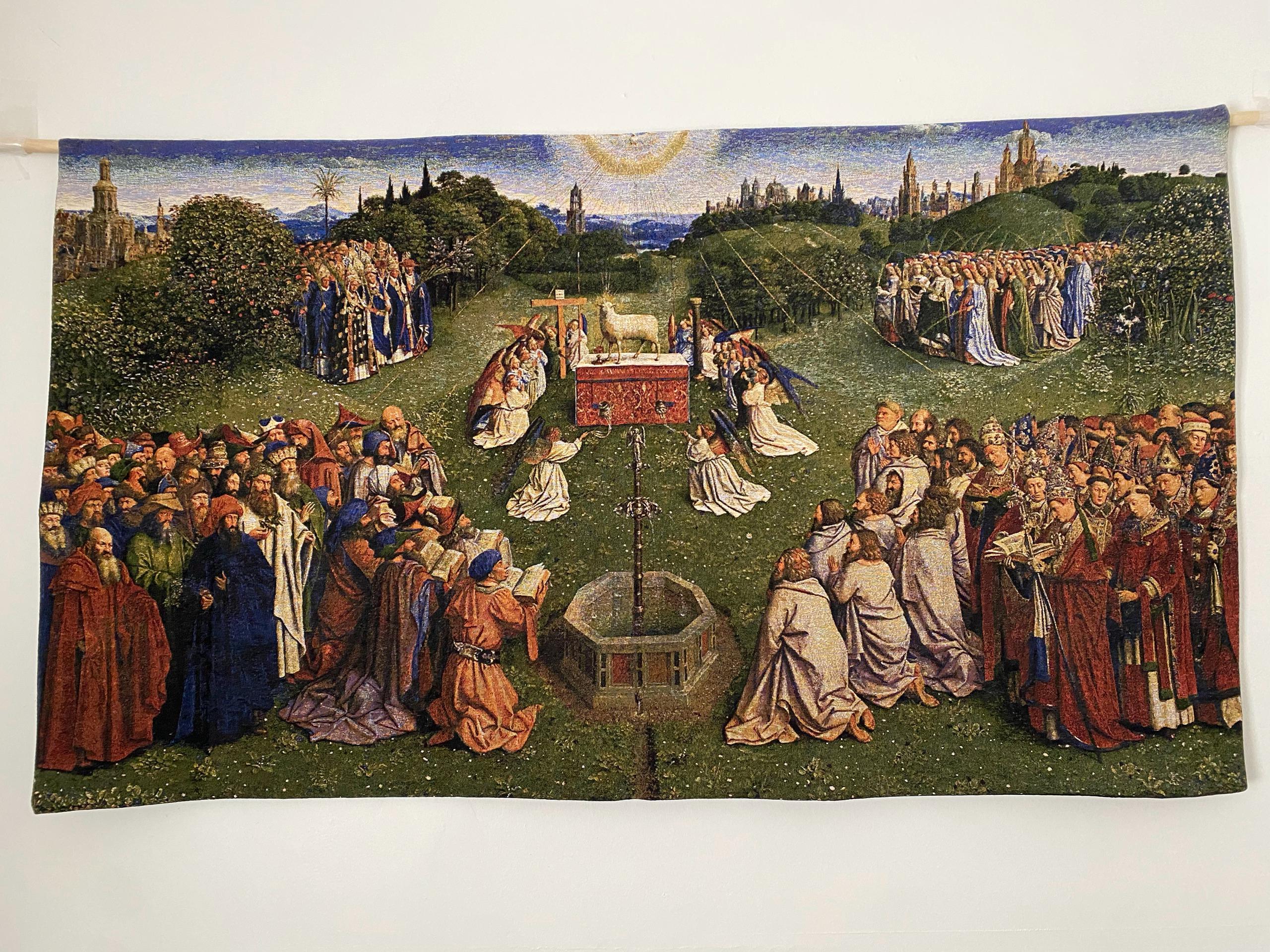 This Museum Collection wall tapestry shows the famous painting Adoration of the Mystic Lamb by Jan Van Eyck (before c. 1390 – 9 July 1441)who was an Early Netherlandish painter active in Bruges and one of the most significant Northern Renaissance artists of the 15th century. This paiting is part of a very large and complex early 15th-century Early Flemish polyptych panel painting. The altarpiece comprises 12 panels, eight of which are hinged shutters. Each wing is painted on either side, giving two distinct views depending on whether they are open or closed. Except for Sundays and festive holidays, the outer wings were closed and often covered with cloth. It was commissioned to Hubert van Eyck, about whom little is known. He was most likely responsible for the overall design, but died in 1426. It seems to have been principally executed and completed by his younger and better known brother Jan van Eyck between 1430 and 1432.Although there have been extensive attempts to isolate passages attributable to either brother, no separation has been convincingly established. Today, most accept that the work was probably designed and constructed by Hubert and that the individual panels were painted by Jan.